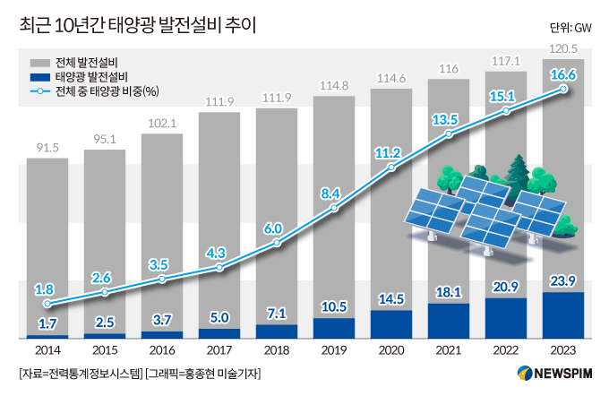 ◆ 태양광발전 급증했는데 송전망 확대 '발목'…5년새 출력제어 7배 급증태양광은 태양의 빛 에너지를 전력으로 변환해 사용하는 기술로, 풍력과 더불어 대표적인 신재생에너지로 손꼽힌다. 무한한 자원인 데다가 친환경적이고, 분산 발전이 가능한 점 등 여러 장점이 있어 세계적으로 큰 주목을 받고 있다. 미국·중국·유럽연합(EU) 등 주요국들도 태양광 발전에 대한 투자를 확대하는 추세다.우리나라에서 태양광은 지난 이명박 정부 시절부터 본격적으로 증가하기 시작했다. 당시 정부는 신재생에너지 보급 확대를 목표로 태양광 설치에 대한 보조금 지원 사업을 추진했다. 태양광은 초기 설치 비용이 많이 든다는 단점이 있는데, 정부의 지원으로 이를 상쇄할 수 있게 되면서 설치 수요가 크게 늘었다.전력통계정보시스템에 따르면 지난 2014년 1.7기가와트(GW)에 그쳤던 태양광 발전설비는 매해 증가하기 시작해 지난해에는 23.9GW까지 늘어났다(아래 표 참고). 10년 만에 약 14배 불어난 셈이다.
